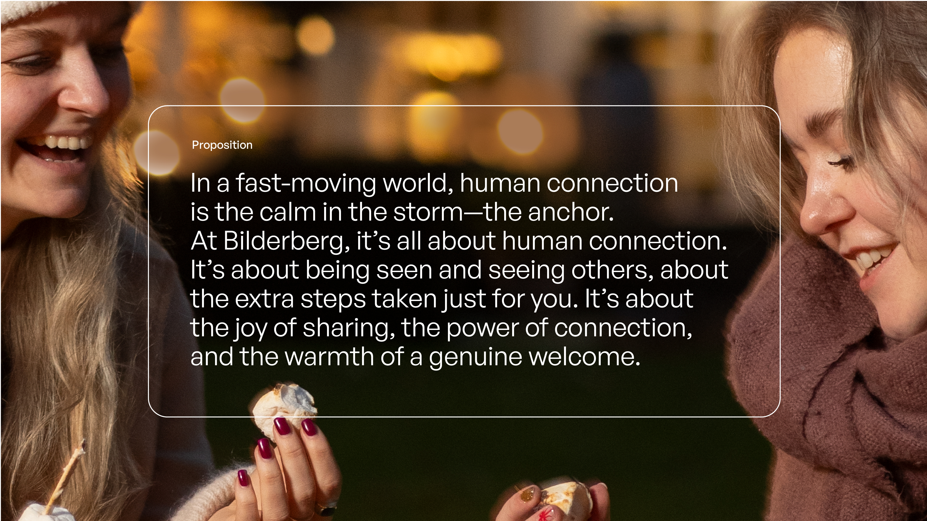 A brand that stands out in a sea of sameness. One that whispers instead of shouts, invites instead of sells. Above all, a brand that feels authentic. In a world racing forward, there’s nothing more powerful than pausing for a moment and paying attention to one another. That is the essence of Bilderberg.