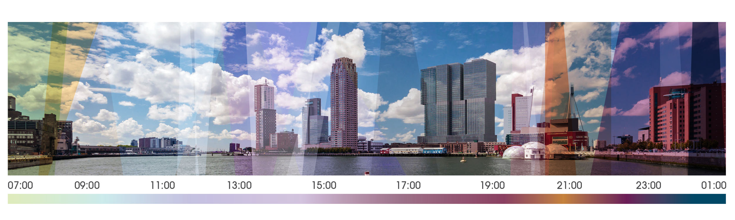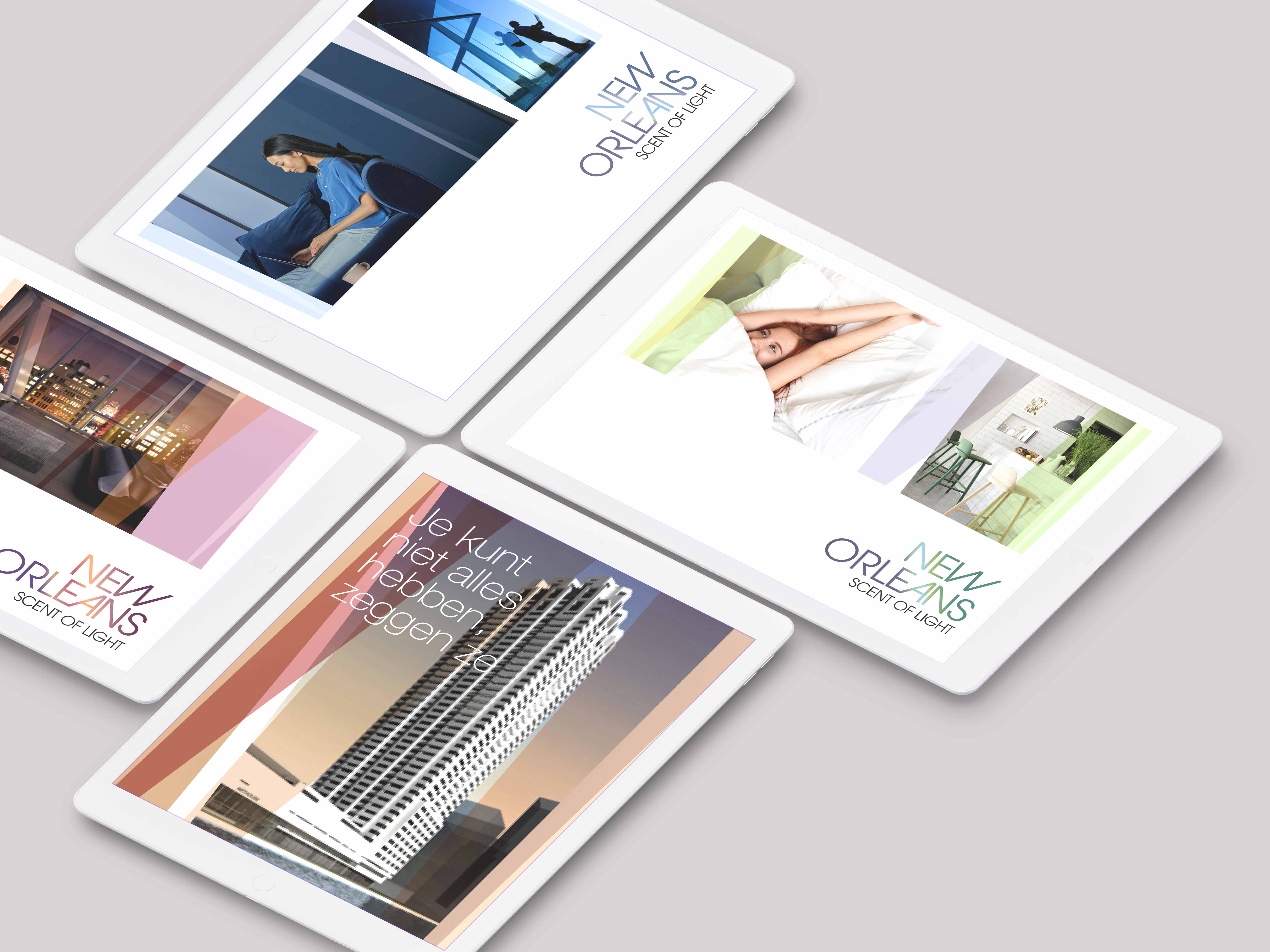 The main theme for the identity was the concept of light and how it moves and changes throughout the day. The shafts of light are represented by the coloured transparent shapes that carry through the whole identity. The colours change as the light streams through the unusual shaped windows of the tower, changing hue, shape and direction as each hour passes.